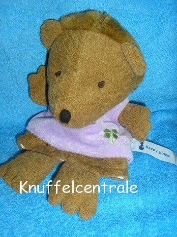 Overige info: Handpop, knuffel met lila jurkje / truitje. Hierop een klaver 4