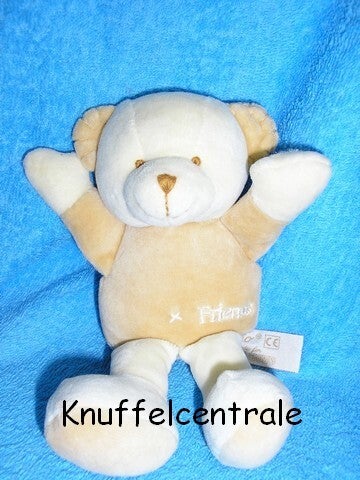 Overige info: Rammeltje in de buik., wollig gevuld. Geborduurde ogen neus en mond. Feston steekjes rondom de oren. op het lijfje (truitje) een kruisje als navel en de tekst Friends ernaast.