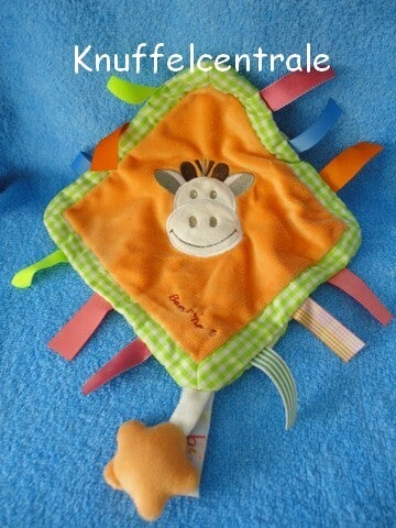 Overige info: Oranje velours doekje boven + onderkant met groen wit geruitte rand. In het doekje een piepje, aan het puntje van de doek hangt een oranje ster.