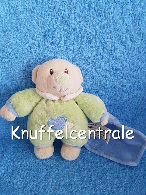 Overige info: Wollige vulling. Geborduurde ogen en mond, groenne usje. Groen pakje met blauwe randen en witte kraag. Applicatie van blauw en geel hartje. Blauw doekje in de handen, achterkant doekje is katoen.