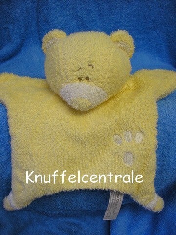 Overige info: dikke wollig gevulde kop. Applicatie van een pootafdruk voor. Goud(bruin) geborduurde ogen + wenkbrauwen. Witte snuit met geel neusje, binnenkant oren wit en randje om de voeten wit.