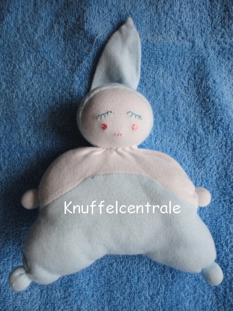 Overige info:Puntmuts + onderkant popje blauw, bovenlijf + gezichtje = wit. Wollige vulling. Wenkbrouwen blauw geborduurd, ogen en neusje roze. Label zit midden achter op het hoofd.