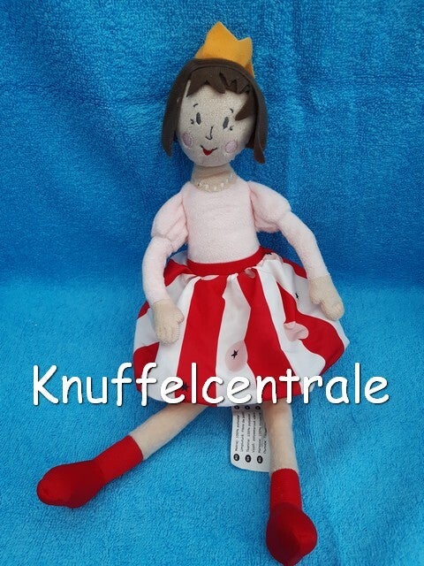 Overige info: Kroontje en haren van synth. velours. Geborduurde ogen, neus, wangen en mond. lijf en truitje zacht velours en ballonrok van een glanzend katoen polyester stofje.