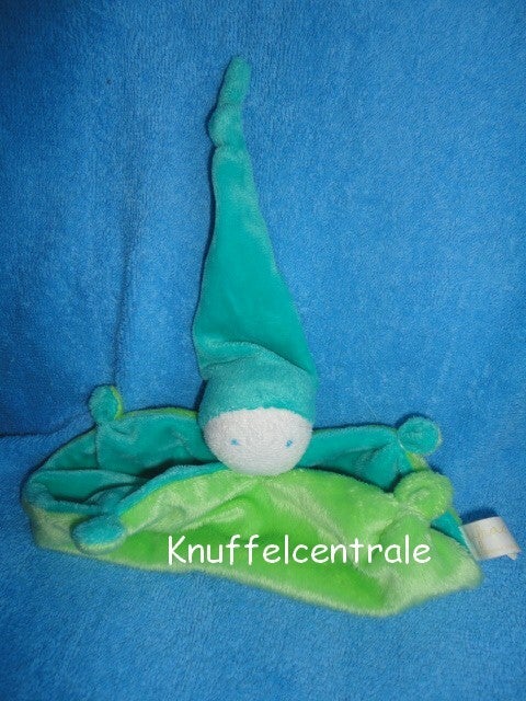 Overige info: Muts + binnenkant = groenblauw, buitenkant is gras, fel groen. Gezicht is ook van velours, wit, met blauw geborduurde ogen