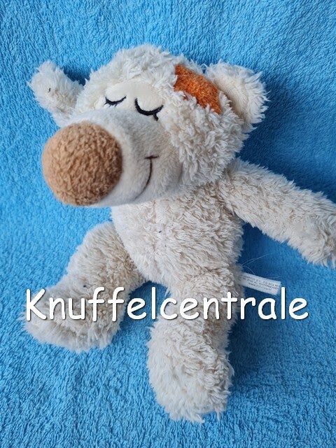 Overige info: Wollige vulling. Oranje lapje op het hoofd. ogen dicht (geborduurd). Puntige snuit met bruine neus