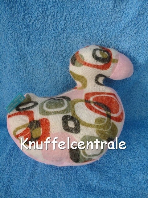Materiaal: zijkant beetje wolachtig met retro print, onderkant en snavel roze velours.