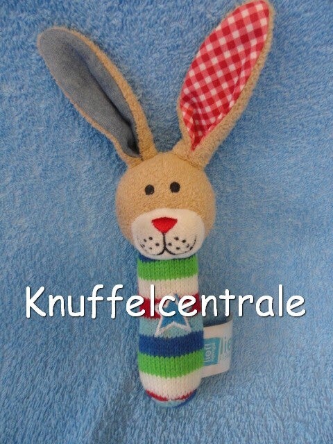 Materiaal: velours hoofd, gebreid handgreepje, katoen binnenkant oren
