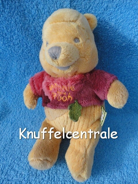 Het rode truitje bestaat ook uit verschillende kleuren, en er zit een blaadje aan zijn trui. Ogen met grijs geborduurd + neus en mond. Op het truitje staat Winnie the Pooh geborduurd.