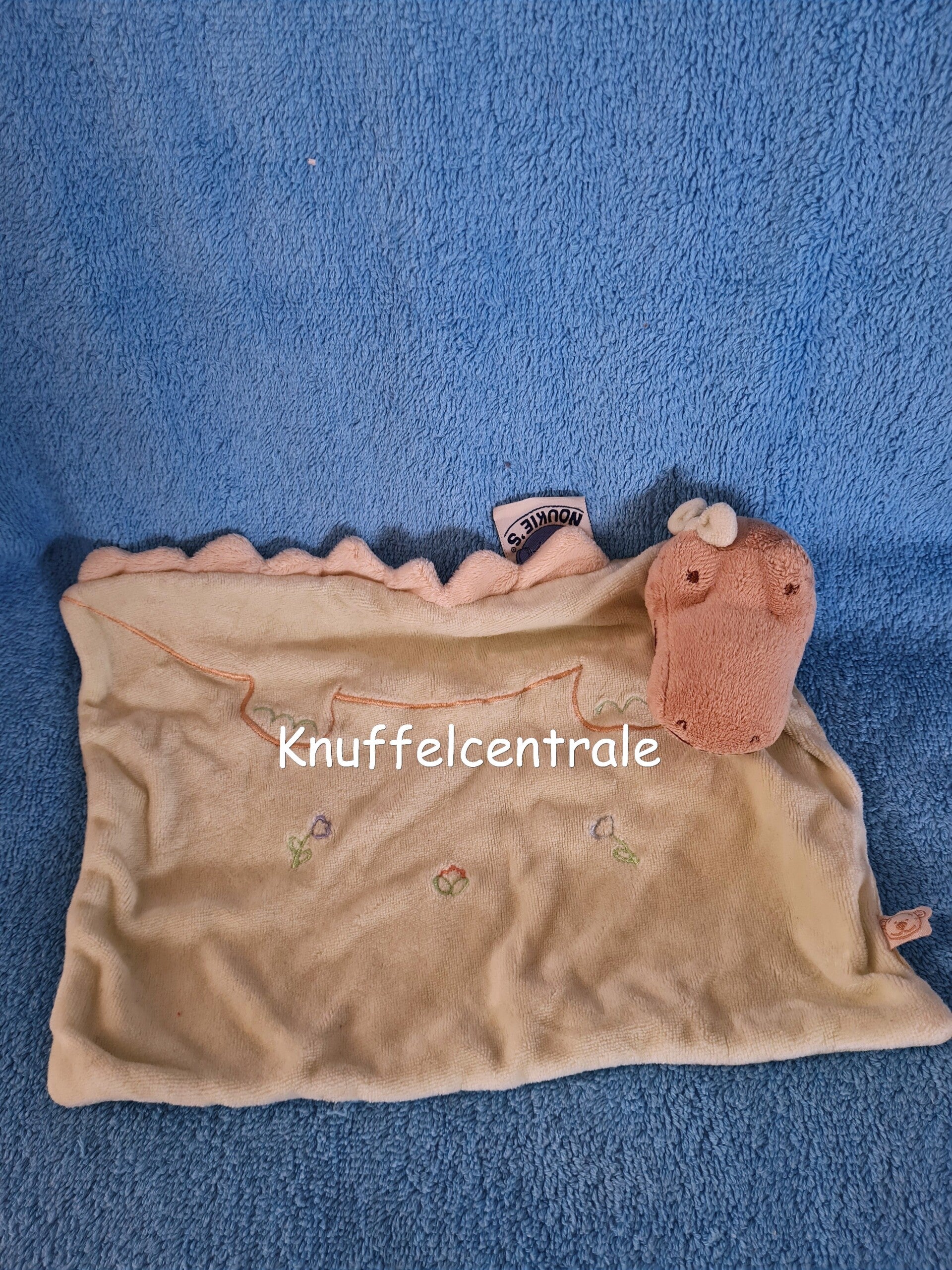 Overige info: Ietwat langwerpig knuffeldoekje met bovenin de hoek krokodillenkop met strikje op het hoofd . Doekje is groen (wat lastig te zien op de foto) lijf van krokodil is op het doekje geborduurd. hieronder zijn bloemen geborduurd . Achterkant doekje groen katoen.