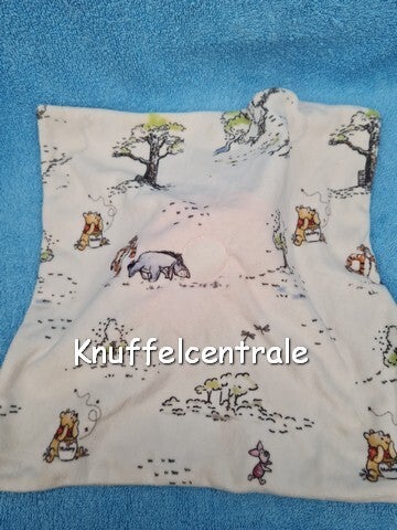 Overige info: onderkant doek wit met fellere print van alle friends en Pooh zelf. bovenkant doek licht grijs. Zilver geborduurde ogen, wenkbrauwen en een stoffen grijze neus