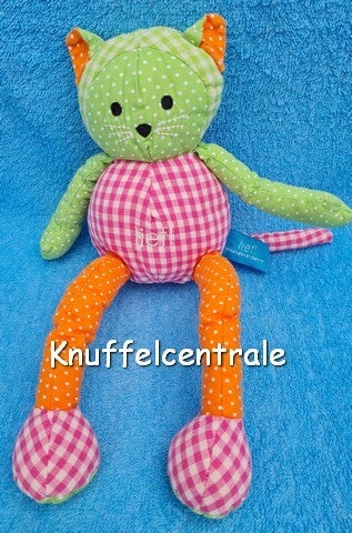 Overige info: helemaal van katoen. Zwart geborduurde ogen en neus wit geborduurde snorharen. De knuffel heeft wat korrels in de billen. Knuffel met een beetje "O"benen