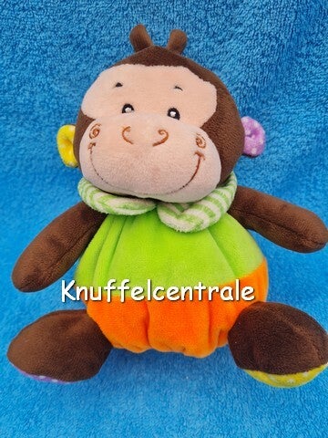 Overige info: basis is bruin, lijf is fluor groen met fluor oranje. onderkant poten net als binnenkant oren paars en geel met wit stipjes. Kraagje van wit met groen streepje. wollig gevuld. Geborduurde ogen , neus en mond.