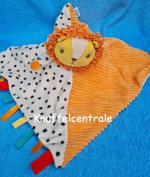 Overige info: 3 foto's ; foto 1; hier zie je beide kanten tegelijk, foto 2: de aap kant, foto 3: de leeuw kant. Kant van de aap: hoofd en armen van katoen(achtige) stof, rammel in het hoofd. 2 armen. Doek is deels blauw velours (met zwart stipje) en creme velours rib. Kant van de leeuw; katoen gezicht, katoen haren, achterkant hoofd velours. 1 arm velours. deel doek is wit velours met zwarte stip en oranje ribstof. In het hoofd een piepje