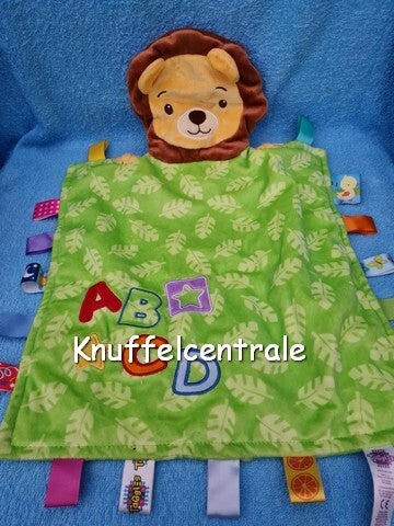 Overige info: mega grote knuffeldoek alsof de leeuw onder een deken in bed ligt. Heeeel veel labels aan de zijkanten rondom. Groene doek met creme gele blaadjes print en A, B, C en sterren als applicatie.