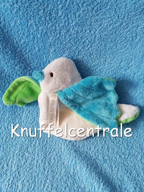 Overige info: Lichtblauw/witte vogel met blauw / groene vleugels en knisperstaart. geborduurde ogen