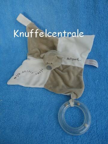 Overige info: Doekje met in het midden bovenop een berenkop, duimgat eronder. Op de hoek zit een lus met klitteband voor de speen . In deze hoek zit ook knisper. Aan de andere hoek zit een rammelaar/bijtring vast. tekst: Dikke knufel